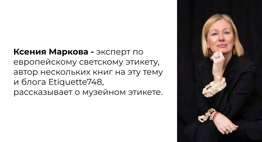 Многие воспринимают этикет как свод устаревших правил. Однако этикет не устарел и в наши дни, по - тому что его задача облегчать жизнь. Сегодня для читателей нашего журнала Ксения Маркова, эксперт по европейскому светскому этикету, автор нескольких книг на эту тему и блога Etiquette748, рассказывает о музейном этикете.