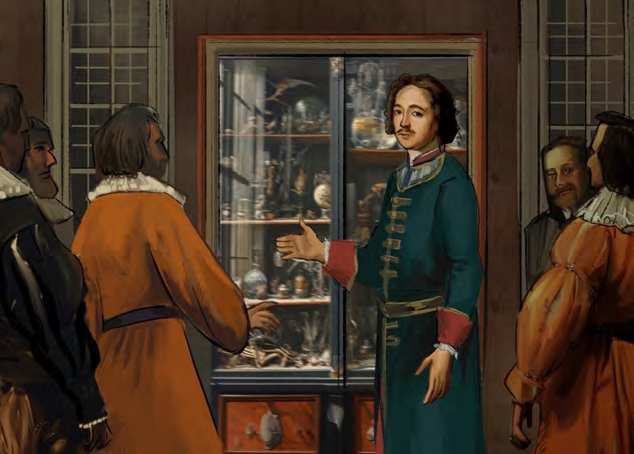 Во-первых, Пётр осматривал достопримечательности во всех городах. Во-вторых, знакомился с западными музеями того времени и частными коллекциями. Например, в Голландии он не только из - учал кораблестроение, но и посетил медицинский ботанический сад и музей Рейкс, который славился тогда зоологи - ческой коллекцией и коллекцией анатомических препаратов. В Лейдене русский император посетил Лейденский университет, его музей и ботанический сад. А в Амстердаме ознакомился с частной коллекцией Якоба де Вельде, в который были книги, глобусы, античная бронза и т. д. Говорят, сильное впечатление на Петра оказала Дрезденская кунсткамера, где была собрана не только естественноисторическая коллекция, но и собрание прикладного искусства. Все эти коллекции показали Петру I возможность просвещения через наглядность. И эта форма никак не могла быть заменена просто книгой. По возвращению Пётр начинает собирать собственный «кабинет редкостей», который сначала находился в Москве, а затем был перенесён в новую столицу. В 1714 году этот кабинет расположился в Людских палатах при Летнем дворце и был назван на немецкий манер Кунсткамерой. В состав петровского «кабинета редкостей» не вошла царская сокровищница, которую не перевозили в Санкт-Петербург, а оставили в Оружейной палате Московского Кремля. В первом публичном музее были собраны монеты и медали, старинные книги и рукописи, гербарии, чучела животных, образцы древесины, минералы, раковины, растения, анатомические пособия, образцы, картины и другое. Кунсткамера была не только музеем, но и просветительским учреждением, так как была бесплатно открыта для посетителей. Она является примером первого целенаправленного собирательства в на - шей стране. Пример Петра I стал импульсом для частного коллекционирования в России. Именно вслед за императором начинаю коллекционировать его сподвижники — Меньшиков, Шереметьев, Голицын. Затем подключились другие состоятельные фамилии.