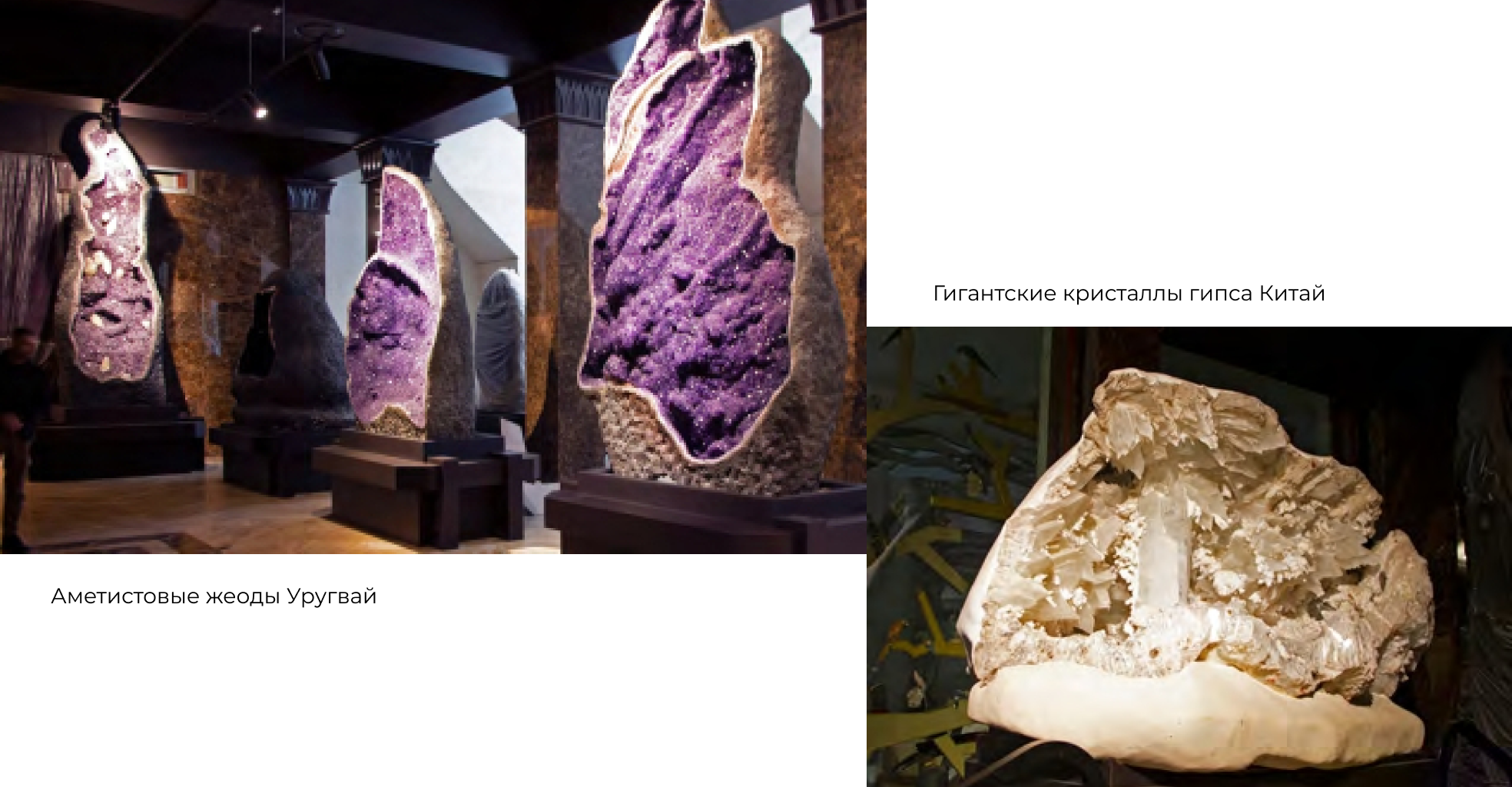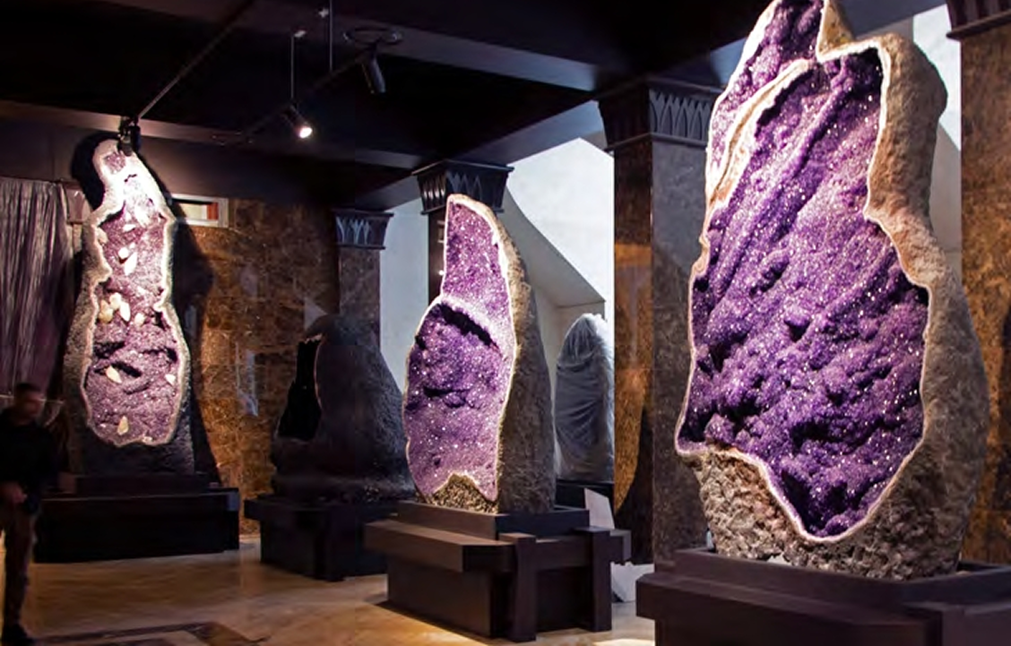 Аметистовая коллекция состоит из сотен камней, некоторые из них имеют колоссальные размеры (самые крупные весом 12-14 тонн и высотой 8 метров), а 5 экземпляров превосходят по размеру самый большой в мире аметист, представленный в Книге рекордов Гиннеса. Эти жеоды аметиста происходят из базальтовых плато Рио Гранде де Сол на территории Бразилии и большей части Уругвая. Собрание это, по нашему предположению, является самым крупным в мире. Подобные образцы присутствуют в коллекциях различных музеев мира, но в единичных экземплярах. Коллекция самоцветов представляет собой хорошо подобранное собрание бериллов травяно-зелёного и жёлто-зелёного цвета с блестящи - ми гранями травления из пегматитов Волыни, Украины. С Волыни же происходит гигантский, весом около 100 килограмм, кристалл топаза. Оттуда же огромный, 600-килограммовый, кристалл кварца-мориона. Очень интересна подборка пещерных образований». Дмитрий Лисицын, действительный член Совета по сохранению культурного наследия и развития международного обмена культурными ценностями, эксперт по культурным ценностям Министерства культуры России по специализации минералогические материалы, добавляет, что «первое чувство, которое испытываешь, попадая в музей — потрясение. В залах видим фантастическое сочетание любви к камню, упорства и человеческого труда. Эстетика камня в нём так переплетена с естественно-научным содержанием, что, путешествуя по музейным залам, хочется узнавать про удивительный мир камня всё больше и больше. Музей интересен как с обывательской, так и с профессиональной, и общеобразовательной точек зрения». На сегодняшний день переделан проект второго корпуса музея. Есть немало сложностей, которые связаны с лабораториями института, но он будет достроен быстро, так как точно понятно, что делать. В этом комплексе будет не только музей, но и рудная экспозиция, спа-центр, институт с серьёзной экспертизой, а также большая образовательная база, где будут обучаться не только взрослые, но и дети. Владимир Семёнович считает важным создать культуру камня, пробудить к нему любовь. Пусть кто-то захочет стать геологом, а кто-то преподавателем или экспертом. Рядом с геологией много прекрасных профессий, которые способны захватить и сделать жизнь интересной.