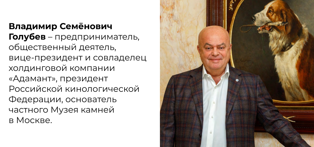 Поднять на поверхность — технологическое искусство. Не каждый зоркий взгляд способен раскрыть их красоту. Мастеров, создающих из этих камней истории, поражающие своим масштабом, силой и ювелирной точностью – единицы, и работы их – невероятная редкость. Но всегда есть люди, не боящиеся сложностей. Их решения и действия вносят весомый вклад в историю, культуру и науку. Герой нашей статьи — Владимир Семёнович Голубев, предприниматель, общественный деятель, вице-президент и совладелец холдинговой компании «Адамант», президент Российской кинологической Федерации, основатель частного Музея камней в Москве.