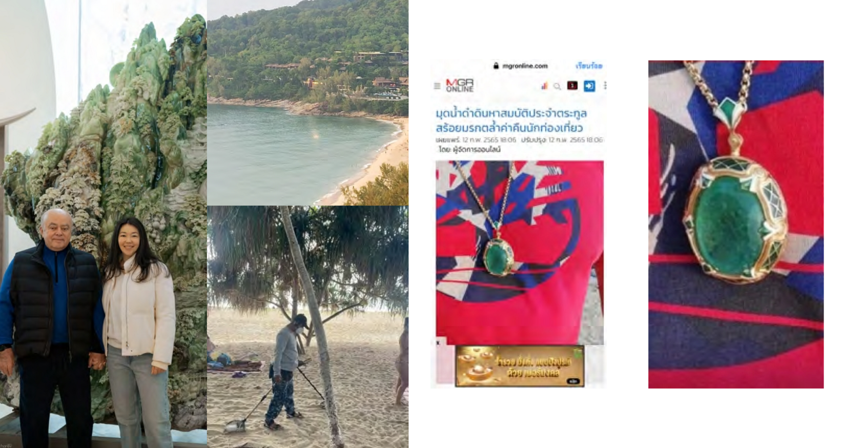 Супруга организовала поиски, вызвала людей с металлоискателями. К поискам присоединились и местные добровольцы. Первый день розыска результата не дал. Камень нашёлся к концу второго дня. И это тоже имело элемент чуда. Мы жили на вилле над заливом, которая буквально парила над пляжем, где мы отдыхали и плавали. Весь день камень искали, а вечером, через час после захода солнца, мой друг увидел с высоты в океане какое-то свечение. Буквально луч. Он предположил, что это мой талисман, но я не поверил. Однако буквально через секунд 30 или 40 мне позвонил помощник и сообщил, что изумруд найден. Его нашёл местный парень, люби - тель, который присоединился к организованным супругой поискам. И нашёл рядом с тем местом, где друг видел луч из океана. Причём за два дня камень был уже под 20-сантиметровым слоем песка. На третий день мы б его не нашли. Все тогда говорили, что это чудо. Об этой истории писали все тайские газеты. Местные рыбаки на своей памяти не помнили, чтоб океан что-то отдавал. После этого в магазинах раскупили металлоискатели, все бросились искать сокровища на берегу океана. Но чудо не повторилось. Удивительное в этой истории и то, что супруга моя волновалась, а я оставался спокоен. Я считал и считаю, что не мы находим камни, а они нас. Жалко, конечно, было, но думал, что в жизни будут и ещё камни. А друг мой, Бронислав Виногродский, очень хороший китаевед, всегда говорил мне, что камни меня любят, поэтому и приходят в мою жизнь. Наверное, действительно любят, раз даже океан вернул мне талисман.